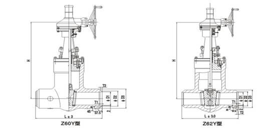 集團生產的Z61Y-250、Z61Y-320 型高壓電站閘閥:手動、對接焊連接形式、明桿楔式剛性單閘板,閥座密封面材料為硬質合金,公稱壓力 PN250~PN320,閥體材料為碳素鋼的高溫高壓電站閘閥。